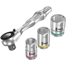 Cliquet Zyklop Mini permettant une utilisation très facile même avec une seule main, y compris dans les espaces réduits. Acier massif forgé. Le mécanisme à fine denture de 60 dents permet un faible angle de reprise de 6° pour un travail précis. La molette permet de visser rapidement dans les endroits trop exigus pour le cliquet. Inversion gauche/droite aisée. Tête et manche du cliquet ergonomiques. Convient aux douilles 1/4". 3 douilles Zyklop avec emmanchement 1/4". Système de repérage d'outils Take it easy : code couleur en fonction de la taille pour trouver rapidement et facilement l'outil nécessaire.