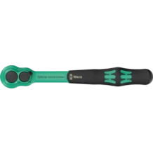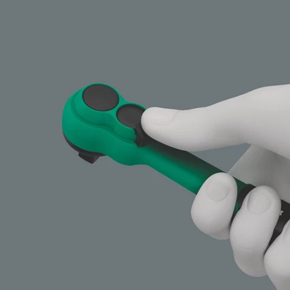 Cliquet Zyklop Comfort avec levier d'inversion au design Wera irrésistible, 3/8". Gainage plastique bicomposant confortable. Protège les surfaces fragiles. Forme fine pour travailler même dans les espaces les plus exigus. La denture fine avec 80 dents permet un faible angle de reprise de seulement 4,5°. Avec levier d'inversion pour changer facilement le sens de serrage. Avec bouton de verrouillage des douilles.