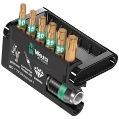 Bénéficiant de la technologie de fabrication mise au point spécifiquement par Wera, l’embout diamanté Wera continue aujourd’hui à faire référence en termes de résistance et de fonctionnalité. Les minuscules particules de diamant garnissant la pointe de l’outil offrent un positionnement antidérapant dans la tête de la vis.