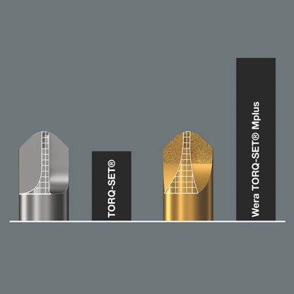 Comparé aux outils dotés de l'empreinte conventionnelle TORQ-SET®, l'empreinte Mplus développée par Wera présente des flancs plus résistants. Il s'ensuit un couple de rupture nettement plus élevé et une longévité largement accrue de l'outil Wera TORQ-SET® Mplus.