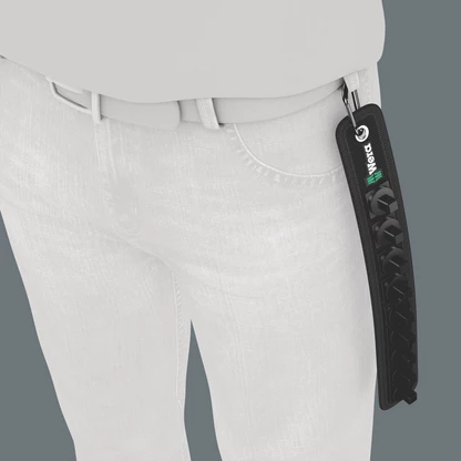 La sangle textile dotée d’un scratch au verso peut être fixée au passant de ceinture, à une sacoche, une servante d’atelier ou au système de transport d’outils Wera 2go.