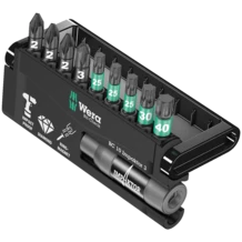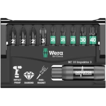 Robuste Bit-Check signé Wera. Les Bit-Checks permettent d'embrasser d'un coup d'œil les outils présents. Les embouts dont on n'a pas besoin restent cantonnés dans l'assortiment et ne sont pas égarés. Transport aisé, dans la poche de chemise par ex. La technologie Impaktor offre des durées de vie supérieures à la moyenne, même face à des exigences extrêmes. Revêtement diamanté rugueux à la pointe de l'embout permettant, grâce à une résistance frictionnelle accrue, d'éviter le ripage hors de la vis. Particulièrement indiqués pour l'emploi avec visseuses à impact/percussion usuelles. Porte-embouts Impaktor permettant d'amortir les pics d'impulsion extrêmes. Effet de torsion spécifique engendré par ressort à double torsion. Avec aimant annulaire, pour un maintien aisé des vis même longues et lourdes, idéal aussi pour les travaux au-dessus de la tête. Aimant pouvant être rétracté et, ce faisant, neutralisé.