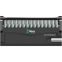 30 pièces. Embouts Wera extra-rigides pour emploi universel. 1 support universel 899/4/1 K utilisable sur visseuse ou porte-mèches de perceuse électronique. Incluant des embouts TORX® extra-rigides, pour emploi universel.
