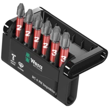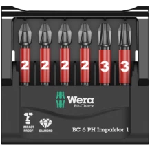 6 embouts Impaktor Wera clairement ordonnancés dans un espace ultra-réduit à l'intérieur du Bit-Check très pratique. Tirant parti à fond des propriétés du matériau et caractérisée par un ajustement géométrique optimal, la technologie Impaktor offre des durées de vie supérieures à la moyenne, même face à des contraintes extrêmes. Le revêtement diamanté rugueux garnissant la pointe des embouts permet, grâce à une résistance frictionnelle accrue, d'éviter le ripage hors de la vis.