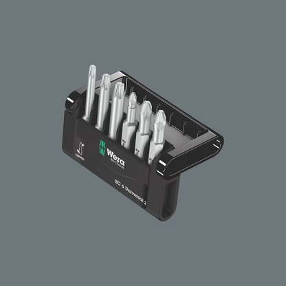 6 embouts Wera de 50 mm de long, clairement ordonnancés dans un espace ultra-réduit à l'intérieur du Bit-Check très pratique. Embouts extra-rigides convenant pour un emploi universel. Sur les embouts Torsion (TZ), les pics de couples sont par ailleurs amortis dans la zone de torsion. L'usure précoce est évitée ; la longévité de l'embout accrue.