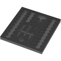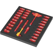 Insert en mousse durable ; bicolore pour repérer rapidement les pièces manquantes ; compatible avec la servante d'atelier Tool Rebel. Comprend 1 cliquet Zyklop 8007 B VDE avec levier d'inversion, 1 tournevis adaptateur avec manche en T 410 i VDE B, 14 douilles Zyklop 8790 B, 6 douilles-embouts Zyklop 8767 B HF avec fonction de retenue pour vis TORX®, 4 douilles-embouts 8740 B HF avec fonction de retenue pour vis à six pans creux, 2 rallonges Zyklop (courte et longue).